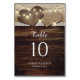 Rustikt bröllopsbord nummerkort med två säckvävshjärtan mot en rustik trä-, säckvävs- och spetsbakgrund dekorerad med ljusslingor.