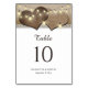 Rustika lantliga bordskort med nummer med två burlap-hjärtan mot en bakgrund av burlap och spets dekorerad med ljusslingor.
