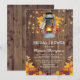 Rustika landsbygdbröllopsinbjudningar med en trägårds bakgrund, höstlöv, en tänd lykta, gnistrande ljusslingor och en modern brudmall.