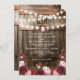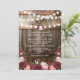 Landbröllopsinbjudningar med en rustik trätunna som bakgrund, gnistrande ljustryckor, burgunderfärgade och rosa akvarellblommor, er monogram och en elegant redigerbar bröllopsmall.