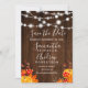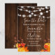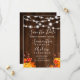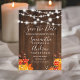Rustika bruna trä med ljustryckta strängar bröllop spara datum med handmålade pumpor, lönnlöv på ett vintage brunt trä och elegant kalligrafi typografi. Perfekt för höstbröllop. Perfekt för landlig, lada bröllopsteman.