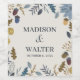 Rustika lövfällande bröllopsbord nummer nattlampa vinflaska etikett