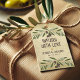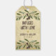 Denna etikett för rustika presentförpackningar med olivolja har olivkvistar med gröna blad och svarta oliver upp och ner. Bakgrunden är gammalt papper. Meddelandet "Smaksatt med kärlek" och namnen är skrivna för hand. Det finns ett (falskt) guldhjärta ovanför namnen.