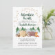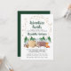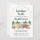 Söt rustik baby sprinkle via post-inbjudan med en söt illustration av skogsdjur med sitt tält på camping i bergen och skogen, en överlagring av guldstjärnor och "Äventyr väntar" och den blivande moderns namn i ett mörkt jägaregrönt manus. Anpassa enkelt detaljerna för sprinkle shower via post.