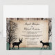 Rustika skogsinspirerade enklade inbjudningskort med silhuetter av en hjort med horn, en dovhjort och vinterträd över en träbakgrund och ett bleknat jägargönt mönster längst ner, uteslutande designade av Artistically Invited. Era personliga vigsel- och mottagningsdetaljer är tryckta över en trasig rustik pappersillustration. Dessa enklade inbjudningskort är perfekta för er skogs- eller hjortinspirerade efterbröllopsfirande.