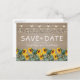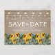 Lantlig country sparad datum vykort med en brun juteslaksduk bakgrund, lampkedja, sommar solrosor i trädgården och en redigerbar textmall.