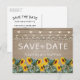 Landsbygdens rustika "save the date" vykort med en brun juteslaksbakgrund, sladdbelysning, sommarsolrosor i trädgården och en redigerbar textmall.