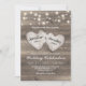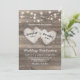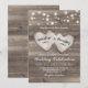 Rustika lantliga bröllopsinbjudningar med en texturerad bakgrund av trädriven, strängljus och två snidade kärlekshjärtan med parets namn.