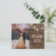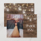 Denna vackra och eleganta tacksamhetskort har ditt eget foto, och rustika murskår och strängljus på en mörk träbakgrund. Lätt att anpassa med ditt eget foto, namn och tacksamhetsmeddelande. Vänligen kontakta mig med eventuella ytterligare designanpassningar du kan behöva för ditt vackra bröllop. Design © av TK Goforth. För koordinerade produkter, besök min Rustic Mason Jar och String Lights bröllopssamling och min Zazzle-butik:
