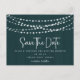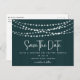 Rustika Teal Träljus i Sträng - Spara Datum - Det perfekta Spara Datum för bruden och brudgummen som älskar ett rustikt tema. Rustik trä med lysande strängljus handskrivna typsnitt och hängande grönska. Baksidan av mallen tillåter din returadress och QR-kod till din bröllopswebbplats.
