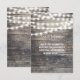 Rustika trä och strängljus bröllopsbiljett gästinformation. Lägg till all nödvändig information för dina gäster på denna vintage grå träbakgrund dekorerad med strängar av ljus. Perfekt bröllopsinbjudan för bröllop med nattljus tema, ladutema, trädgårdstema, utomhusbröllop med tindrande ljus.