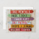 Ett postkort med en rustik träskylt med riktningspilar för skidområden. Skicka hälsningar till vänner och familj från din fantastiska skidresa! Du kan anpassa varje pil för att matcha ditt favoritskidområde eller lämna det som det är.