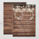 En rustik bröllopsinbjudan för par med vackra strängljus och en delikat handritad rustikal blomsterkrans av botaniskt bladverk med stilfull skripttypografi, på en rustik träbakgrund. Designad av Thisisnotme
