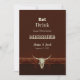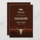 Lantlig västern cowboy äta dricka gift rolig brun trä bröllops inbjudan. Rustik tjur skalle. Använd lite humor med dessa söta, roliga lantliga inbjudningar i farmhouse stil. Ät, drick, för vi gifter oss kan anpassas. Trendig, gammal vilda västern vintage antik design. Cool bond djur. Anpassa skrift och typografi. Bild upphovsrätt Marg Seregelyi Photography.