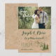 Rustikt bergbröllop Save the Date-inbjudan har en brun kraftbakgrund. En grön bergskedja och träd finns högst upp på inbjudan och typsnitt i grönt i roliga teckensnitt och stilar genom hela inbjudan. Matchande pappersvaror och produkter för denna uppsättning finns i vår butik.