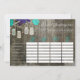 Det här fantastiska rustika bröllopsdusch-spelet Scattergories kommer att få dina gäster att le på nolltid! Det här sällskapsspelet har en rustik lada träbakgrund med turkosa och lila blommor högst upp med murarljus hängande från dem. Inuti murarljusen står orden "kärlek" i olika färger. Ett fantastiskt bröllopsspel som gästerna kommer att prata om i flera år!