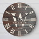 Personligt familjenamn, monogram och etableringsår Rustik modern väggklocka i en trendig farmhouse-stil med romersk siffra urtavla och mörk träplank / shiplap bakgrundsdesign. Perfekt gåva till nygifta, bröllop eller husvärmegåva eller gåva till mor- eller farföräldrar, eller för en hemrenovering i din stuga, cottage eller lanthus.