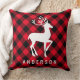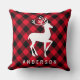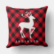 En rustikt röd och svart buffelmönstrad kastkudde med en vit hjortsiluett och familjens namnmonogram. Det djärva rutmönstret och den eleganta hjorten skapar en mysig, stug-inspirerad julaccent. Personifiera med din familjs namn för en unik julgåva. En varm och inbjudande tillägg till soffa, stuga och eldstadssoffa.