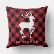 En rustikt röd, svart och vit buffelrutig prydnadskudde med en vit hjort siluett och familjen namn monogram. Tillägget av vitt till det klassiska röda och svarta rutmönstret ger denna design en lättare, mer grafisk känsla samtidigt som den behåller sin mysiga julkaraktär. Personalisera med din familjs namn för en meningsfull julpresent eller säsongsaccent.