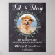 Sit & Stay ~ Mina föräldrar gifter sig idag! Ta med din bästa hund, bästa katt och alla husdjur på bröllopet med sin egen välkomstskylt för husdjur till dina gäster. Perfekt för hundälskare, gör den perfekta bröllopshundskylten. Enkel men elegant rustik svart tavla i skiffer med eucalyptusblad. Anpassa denna brölloppsskylt för husdjur med din hund, katt, valp eller kattunges favoritfoto, namn och datum! COPYRIGHT © 2020 Judy Burrows, Black Dog Art - Alla rättigheter förbehållna. Personlig rustik välkomstskylt med hundfoto för bröllop.