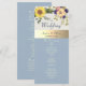 Bohemisk, rustik, elegant, botanisk, dammig blå bröllopsprogram med solrosor och grönska.