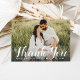 Enkel elegant bröllops-kortmall för tackkort med funktionen Tack i en penslad handskriven typsnittsstil med eget monogram och ett landskapsfoto av bruden och brudgummen på framsidan med ett annat landskapsfoto och anpassad text som kan anpassas på insidan. Den mörkgrå / mjuka svarta och vita texten och bakgrundsfärgen kan anpassas helt.