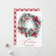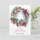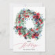Glad helg, fira jul- och vintersäsongen med denna rotsfärgade, marinblå och botaniska grönt krans med blommor, heliga bär, gräs grenar med en redbar nätflanbakgrund.