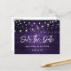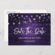 Rustic lila bröllop spara datum vykort med rustiskt trä försett med strängen ljus.