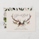 Rustiskt foliage, blommigt och stag antlers bröllop spara datum-kort. Med vackra vattenfärgade blad, vita blommigtar, träsegment och manuskript. Detta moderna inbjudan kommer säkert att sätta stil för ert kommande party.