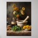 Ett vackert sammansatt, rustiskt liv med en stenmurbruk och sten, färska örter, blommor från gult fält, och vintage glas apotekärt flaskor med kork toppar. Den jordnära bakgrunden och det slida bord förstärker den nostalgiska charmen hos denna konst, vilket framkallar traditionella växtbaserade metoder och naturlig läkning. Biet är idealiskt för att dekorera naturvårdsbutiker, naturopatiska kliniker, apotek, massagebehandlingsrum, studioer i hälsa, yogautrymmen eller rustiska kök. Den för med sig värme, natur och en känsla av arv till alla platser.