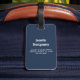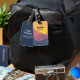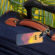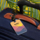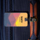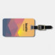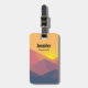 Ett bagagemärke med en grafisk illustration som visar många bergsområden toppar med starkt solljus i gulten bakom bergen. Tillverkad med geometriska polygonformer.Enkel minimalistisk design. Färg sträcker sig från mörk blått till ökenrött.