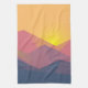 Kökshandduk med en grafisk illustration som visar många toppar med starkt solljus i berget bakom bergen. Tillverkad med geometriska polygonformer.Enkel minimalistisk design. Färg sträcker sig från mörk blått till ökenrött.