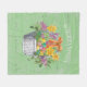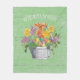 Den här personlig blommigt Påskens temafilt för fleece har en geustik utformning av en vit basket av gult och lila vår blommor och Påskägg i skuggor av gult, lila, grönt och turkos med din familj namn i vit typografi på en fin grönt av vävat trä. Designad av världsberömd konstnär ©Tim Coffey.