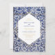 Den här konstruktionen har den portugisiska plattan mönster. Texten i bröllop är elegant ramad med en vit och guld färg geometrisk form. Unik bröllopsinbjudan till Azulejo-blått och vitt blommigt med modernt inslag. Det finns även alternativ för matchning av bröllop-kontorsartiklar och andra bröllopsinbjudningsformat.