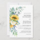 I charming boho stil har den här vackra bröllopsinbjudan en kareffri bukett av gult solblommor och vit ros med efterföljande eucalyptus greenery. Stil är en avslappnad rustik charm och den lycka och glädje du känner på bröllopsdagen. Oavsett om bröllop kommer att hållas utomhus och på en inomhus-bröllop-plats, fungerar den här designen utmärkt för en mängd olika inställningar. Anpassa textmallen med information om bröllop.