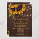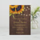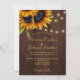 Elegant chic sommar- eller fallskylt för utskrift av bröllop snyggt på bruna lingträ med vackra solblommor bouquet och stringor eller tinkle ljus. ++++++++ Inbjudan är lämplig för elegant sommar- eller höstfallande land-trädgårdslast utomhus eller bakgård bröllop. digital nedladdning finns tillgänglig