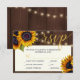 Svarskort på solrosbröllop på rustik höst med måltider på en bakgrund av brunladuvirke med strängar av ljus med skinkl.