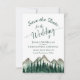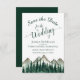 Det här kortet i bröllop spara datum är rustiskt och outdoorsiskt, men ändå elegant och vackert. Det har ett vattenfärgslandskap med hårda bergstoppar med gräs träd i förgrunden. Baksidan är en djup marmorerad grönt färg. Perfekt för att informera dina vänner och din familj om ditt kommande bröllop.