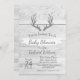Grått-hjortar med silhuett och vitt band med en vit ladugårdsplakor ger en inbjudan att duscha barn. Underbar för en elegant, rustik temdrusdusch för ett mor att vara!