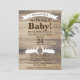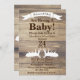 Rustiska barnduschinbjudningar med en varm rustik känsla av ladugårdsplankor och mosmyggor. Baksidan har en annan antennsilhuett runt ett hjärta.