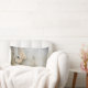 En kudde med ett foto av en söt stoppad björn, som står vid en rustisk trävägg/bakdel.