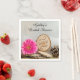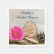 Anpassa den charmerande Rustic Rosa Daisy Woodland Möhippa Papper Napkins med namn i bruden som ska vara. Dessa engångsblöjor av anpassningsbar skogen eller möhippa för skogsinspektion innehåller ett foto av blommigt av en blommar av blomma av rosa gerber daisy, bruna gräs-koner, vit möhippa och träskivor där ord KÄRLEK brinner på den med en brännbakgrund.