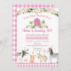 Den här söta födelsedagsinbjudan har vattenfärgsfärg boskap med accenter för rosa blommigt, konetti och rosa gingham gräns.