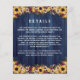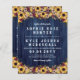 Rustic två i en inbjudan till ett budgetbröllop tryckt på tunnare pappra med solblommor, blommor i och burgundi, bär och sprit mot ett tryckt blått träutseende. Lägg till din namn och din bröllopsinbjudan i typsnitt i rustik. På baksidan lägger du till information om bröllop, t.ex. logi, webbplats, hur du kan ta OSA eller annat du behöver.