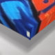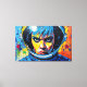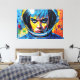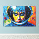 Denna livfulla digitala konst av Otis Porritt fångar en slående figur innesluten i en astronauthjälm, renderad med dynamiska, impastolika penseldrag. Motivets intensiva blå ögon genomborrar ett ansikte definierat av djärva gula och röda nyanser, inramat av elektriskt blont hår. En skarp svart kontur framhäver dragen och skapar en kraftfull popkonst-estetik. Bakgrunden exploderar i ett kaotiskt men färggrant stänkigt mönster som kontrasterar mot figurens fokuserade blick och rymdutrustningens rena linjer.