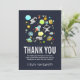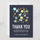 Ett platt tackkort med ett sött och färglöst mönster med alla möjliga rymden temat inslag. I bilder ingår astronauter som flyter runt i sina vita andningsenheter. Stjärnor och planeter och coola fraktaser, rymdskepp och satelliter. Roligt och galen design.