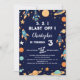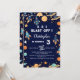 Cute mönster med fraktaser, planeter och stjärnor på marin blå bakgrund. 3, 2, 1, Blast off! Från denna värld, vilken ålder som helst, könsneutralt födelsedagsfest inbjudan.
