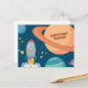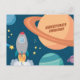 Vykort med roligt rymden-design med planeter, raketer och stjärnor. Det finns en text där man säger Hälsning Friend men kan vara personlig.