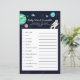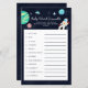 Sött rymdtema baby shower baby ord trassel kort med illustration av planeter, astronaut och stjärnor. Listan med ord på detta kort är alla relaterade till bebisar och de är trasslade. Gästerna kommer att tävla om vem som kan lösa alla först! SVAR NYCKEL: 1. bilbarnstol 2. mjölk 3. lekställning 4. napp 5. blöja 6. gungstol 7. barnkammare 8. babysitter 9. svaddling 10. modersmjölksersättning 11. gummiand 12. barnvagn.
