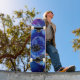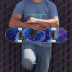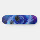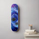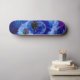 Traditionell vattenfärgsdesign med en blå och lila färgad planet i blått och lila färgad galaxi med flygande sågregat i kubikform som stänger in den på en skateboard.